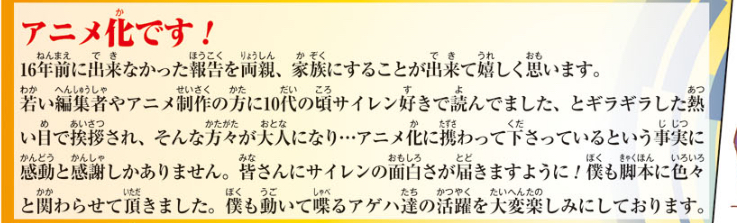 >若い編集者やアニメ制作の方に10代の頃サイレン好きで読んでました、とギラギラした熱い目で挨拶され、そんな方々が大人になり…アニメ化に携わって下さっているという事実に感動と感謝しかありません。